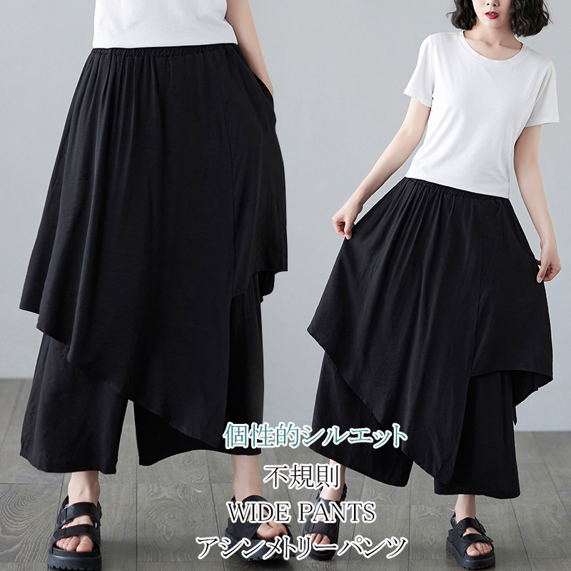 不規則な切り替えスカート風ワイドパンツ パンツ 7分丈 ボトムス 夏 20代 30代 40代 50代 薄手 スカート風 体型カバー 楽チン着心地 おしゃれ カジュアル ゆったり ブラック 黒