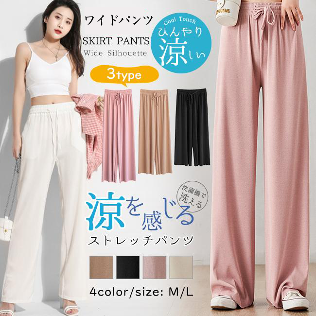 ワイドパンツ レディース 夏 涼しい 涼感 冷感 速乾 パンツ ボトムス ゆったり ガウチョパンツ タック入り ワイド 大きいサイズ 低身長 高身長 ポケット付き