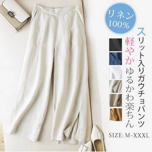 新作 パンツ リネン ワイドパンツ 無地 ガウチョ 麻 亜麻 麻混 タック ゆったり スカンツ パンツ9分