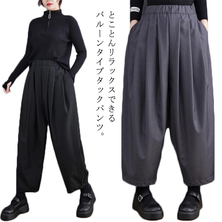スッキリしたタックバルーンパンツ♪ ウェストゴム オフィスカジュアル 通勤 OL お洒落レディースファッション ボトムス パンツ
