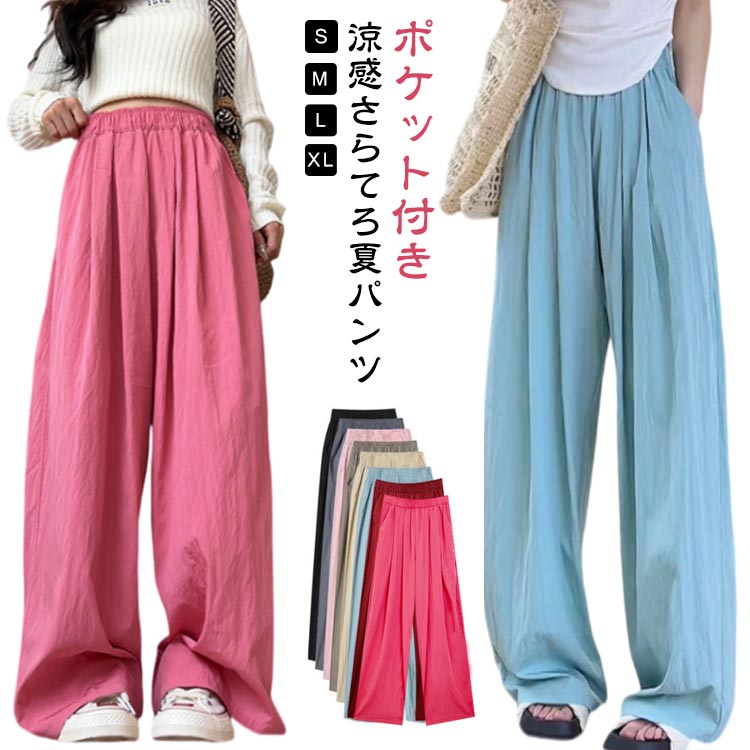 夏 レディース 速乾 長ズボン タック 涼感 チノパン ワイドパンツ 冷感 ゆったり ガウチョパンツ ポケット付き パンツ バギーパンツ 涼しい タック入り ボトムス ワイド 大きいサイズ 韓国 パン