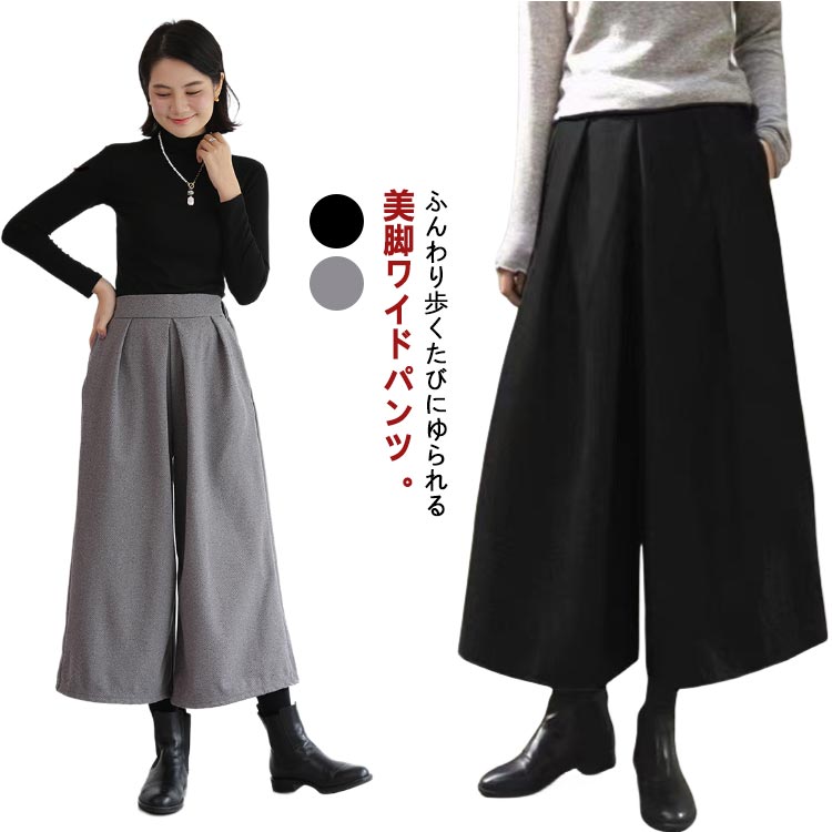 秋冬 ワイドパンツ レディース ボトムス ガウチョパンツ ロングパンツ ブラック 30代 グレー ブラウン アイボリー 20代 40代 ウエストゴム