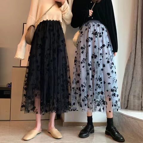 レディース ロングスカート 春夏秋 チュールスカート 花柄 ハイウエスト 通勤 薄手 可愛い ブルー ブラック コーヒー 014