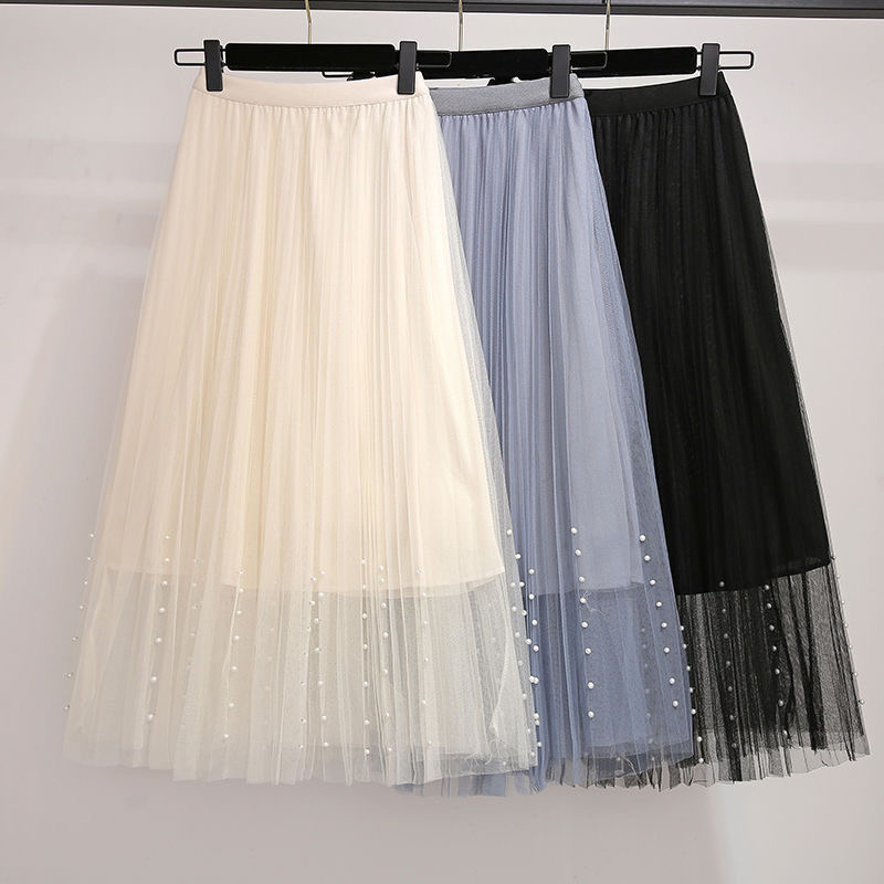 プリーツスカート ロングスカート パール付き チュールスカート 春 夏 秋レディースファッション ボトムス スカート