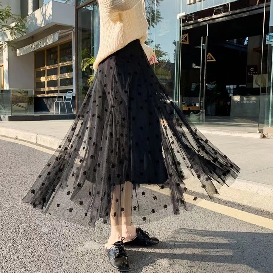 レディース ロングスカート 春夏秋 チュールスカート ハート柄 ハイウエスト 通勤 薄手レディースファッション ボトムス スカート