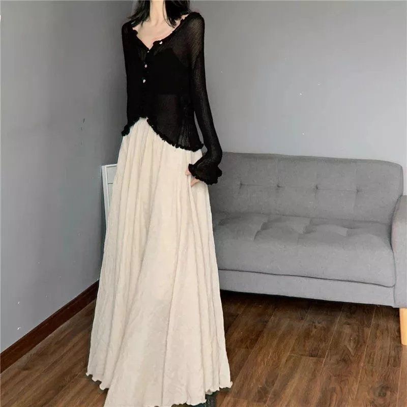レディース ロングスカート 春夏 ハイウエスト 通勤 薄手 可愛い 無地 カーキ 杏色 ブラック 017
