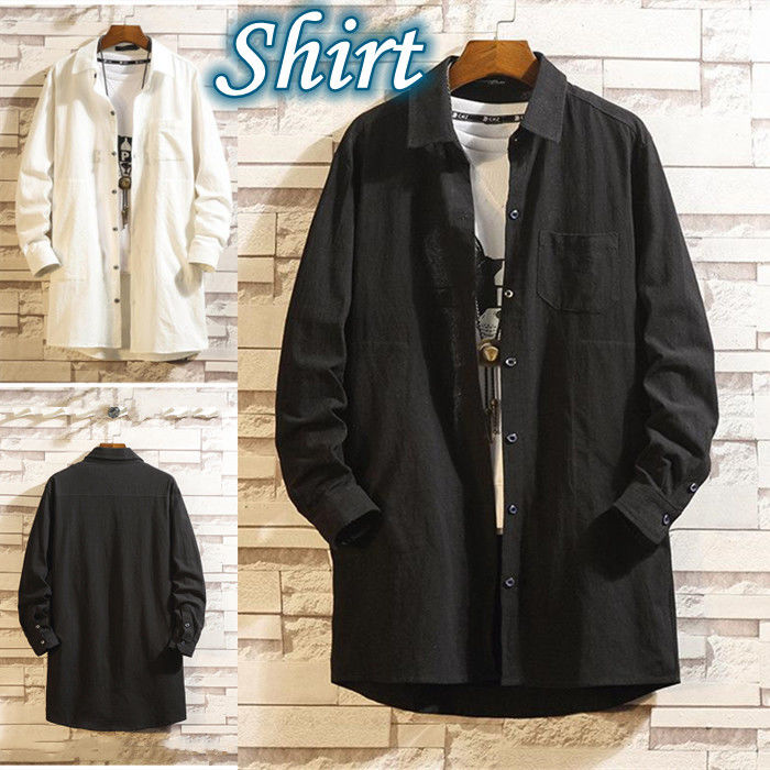 男性用 綿麻シャツ ステンカラーコート ミドル丈 ゆったり柄 アウター 2色 黒色 白色メンズファッション コート ジャケット