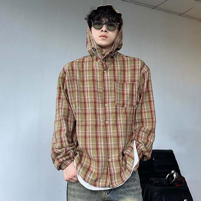 2024春新作 メンズ服 男女兼用長袖シャツチェック柄フード付きカジュアルストリート系メンズファッション コート ジャケット