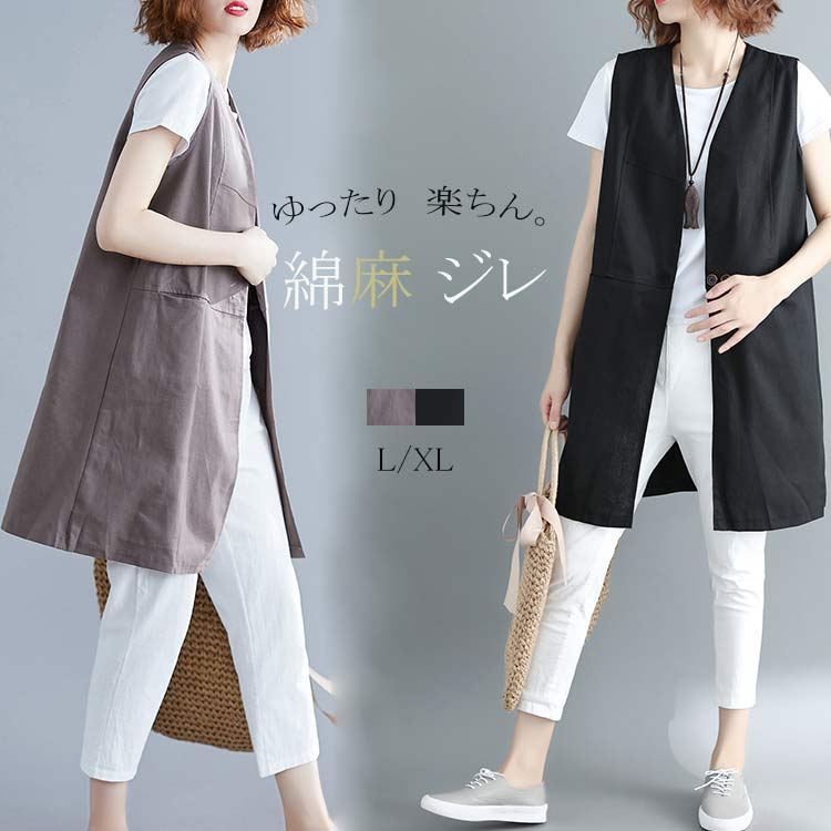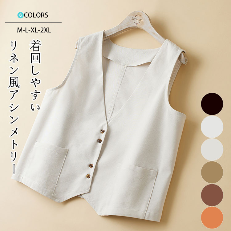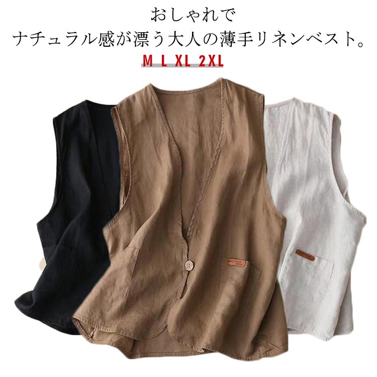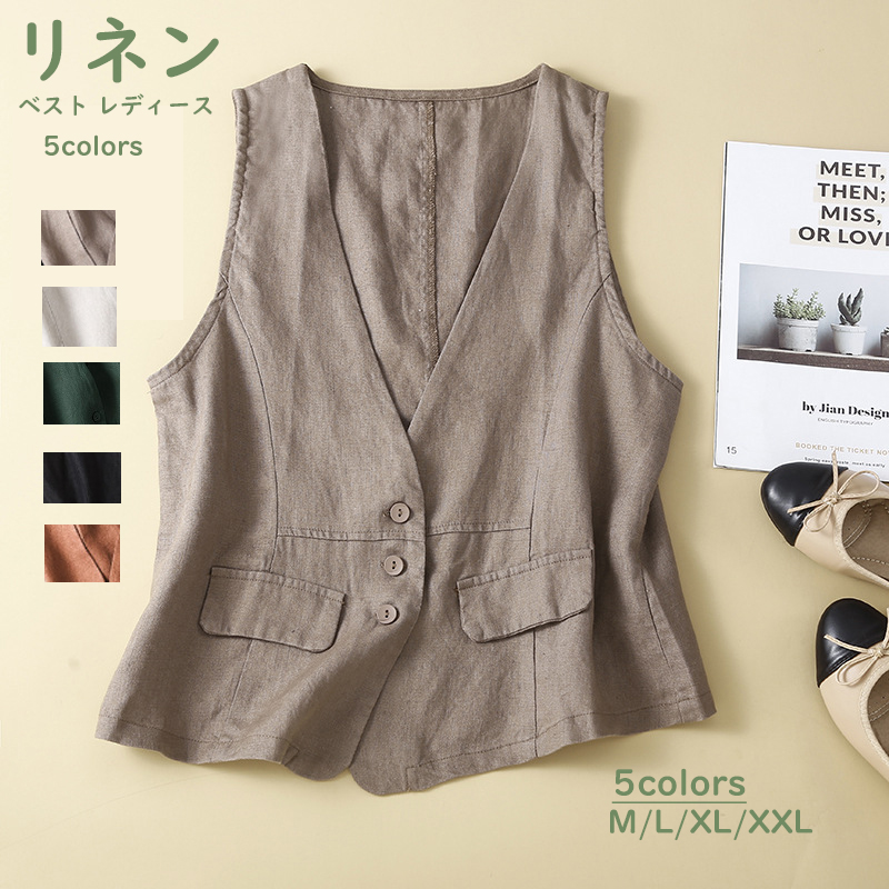 ベスト レディース 綿 麻 Vネック チョッキ 袖なし 前開き ノースリーブ ゆったり ジレ リネン スーツベスト サマージャケット 無地 薄手 夏 通勤
