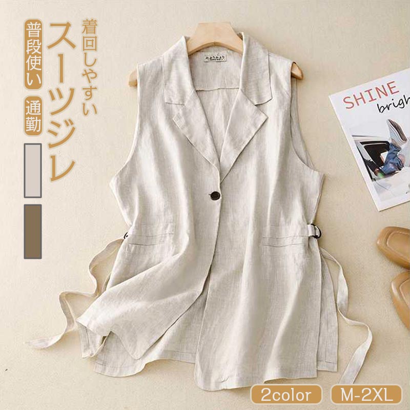 ベスト レディース 綿 麻 ネック チョッキ 袖なし 前開き ノースリーブ ゆったり ジレ リネン スーツベスト サマージャケット 無地 薄手 夏 通勤