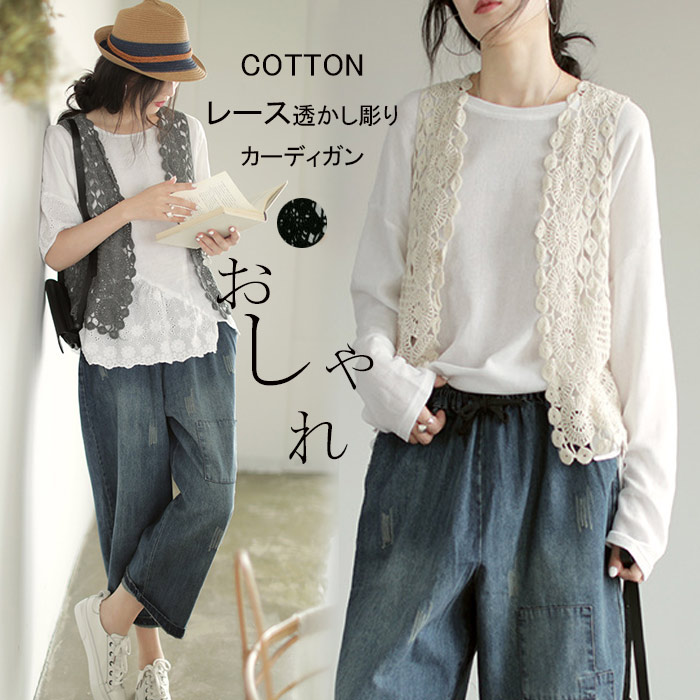 ベスト レディース 春夏 前開き ジレ おしゃれ 大きいサイズ サマーベスト 透かし編み トップス ショート丈 花柄 ノースリーブ 重ね着 カジュアル フラワー 可愛い