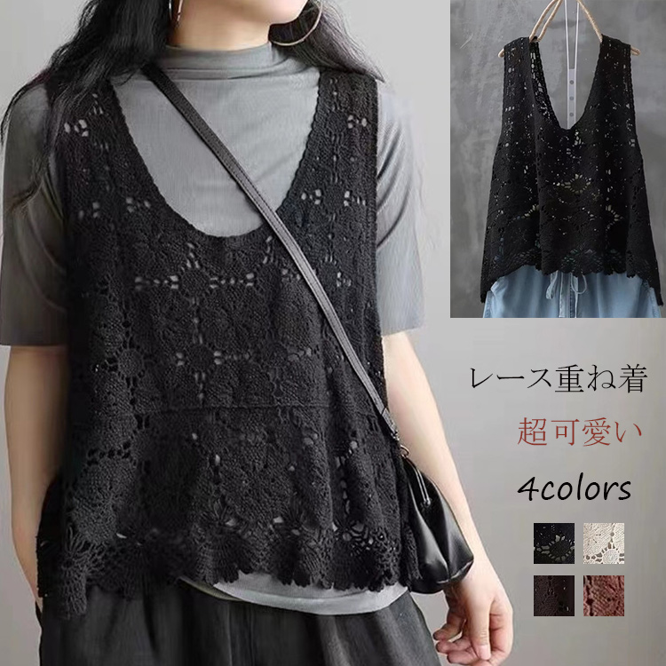 花咲くクロシェ編みコットンベスト レースベスト レディース 春夏 レース トップス ネック 花柄 透かし編み 袖なし レイヤード 綿 着回し ブラック ベージュ コーヒー色 ブラウン