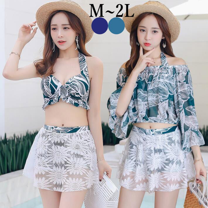 セットアップビキニ 水着 上下別 3点セット レースオープンショルダースカート パレオ リゾート 花柄 ワイヤー入り セクシー大人 おしゃれ袖付きママ ミセス 体型カバー M L 2L