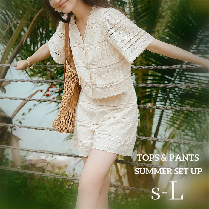 清涼感up~ 総レース ショートパンツ 上下セット 2点セット 大きいサイズ S M L 春夏 ホワイト 白 パーティー お呼ばれ 海 ピーチ リゾート 旅行 夏休み お食事会 デート ♪