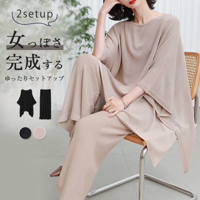 アシンメトリーな裾デザインがこなれ感漂うブラウス 長袖上下☆SETUP ドルマンスリーブトップス&ワイドパンツ♪