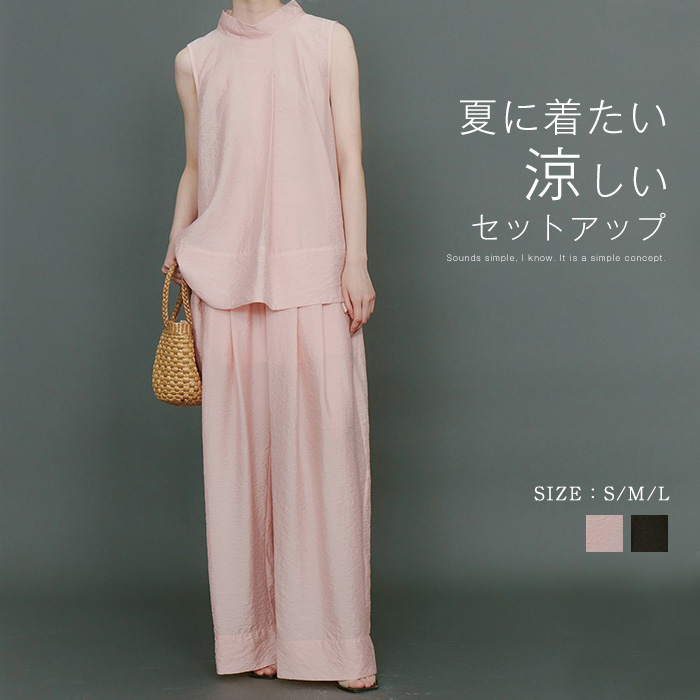 夏らしいベーシックなノースリーブ&パンツSET 使いやすい幅のワイドパンツはデイリーユースに活躍してくれる