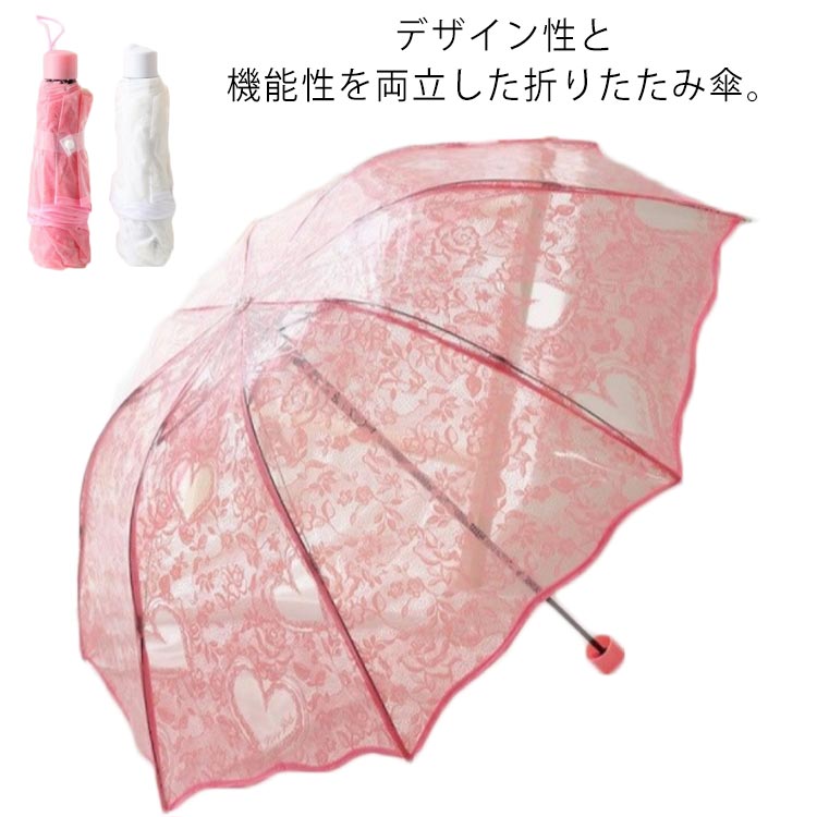 メンズ ビニール傘 8本骨 折りたたみ レディース 開閉ラクラク クリア レース ビニール 透明 傘 3つ折 雨傘 折傘 ピンク