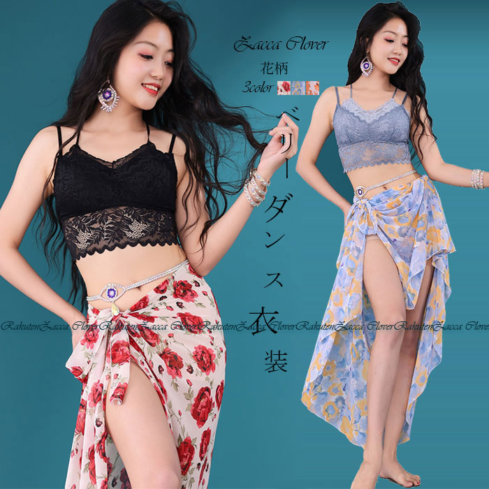 ベリーダンス 衣装 セット レッスン着 セットアップ おしゃれ 花柄 スリットオーバー スカート ロング丈 シフォン 花柄 プリント ダンス衣装 ステージ衣装 ダンス 発表会 上下セット 半袖 ロング