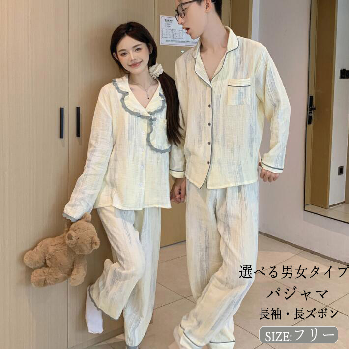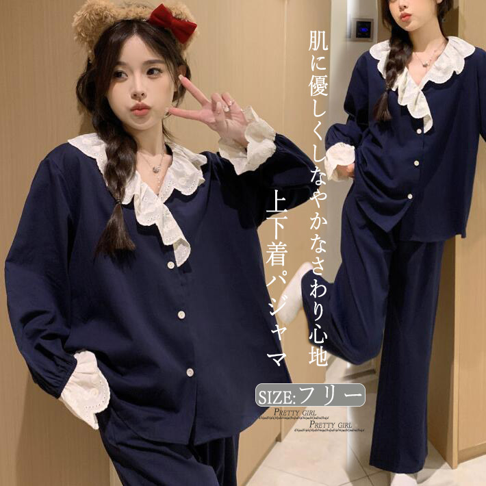 パジャマ レディース メンズ長袖 長ズボン2点セット上下セット前開きレースフリルルームウェア 部屋着 ホームウェア ダ寝間着 寝巻き トップス ズボン可愛い大きめ 春 秋