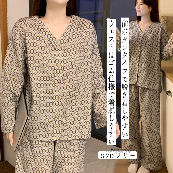 パジャマ レディース 2点セット上下セット前開きレースフリル花柄ルームウェア 部屋着 ホームウェア ダトップス ズボン寝間着 寝巻き 可愛い大きめ 春 秋