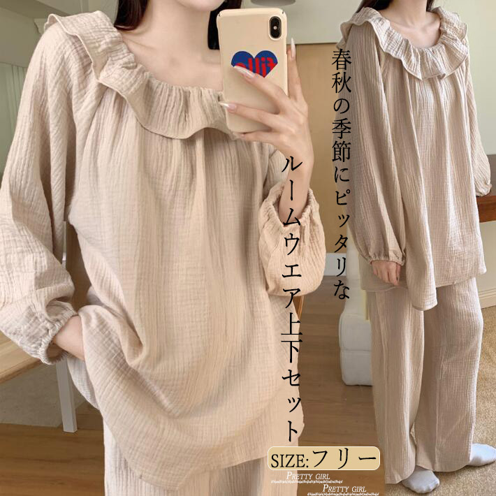 ルームウェア レディース 可愛い 長袖 フリル上下セット セットアップ 2点セット ゆったり パジャマ 部屋着 寝巻き ホームウェア トップス パンツ寝間着 寝巻き 可愛い大きめ 春 秋