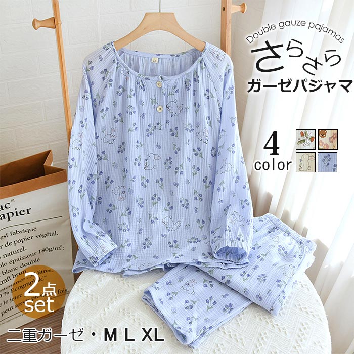 和風パジャマ 春夏 長袖 薄手 涼しい ガーゼパジャマ 二重ガーゼ ダブルガーゼ 丸首 uネック 花柄 母の日 プレゼント