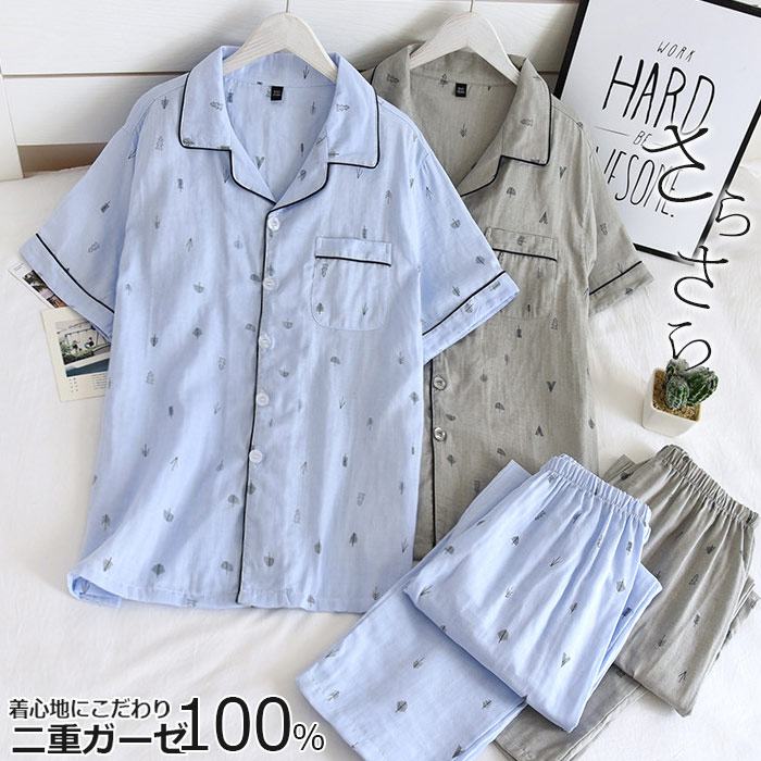 半袖 ネック グレー ブルー 前開き 寝巻き 夏パジャマ男性やわらかガーゼパジャマ薄手前開き 長ズボン入院 外泊 春 夏 男らしい