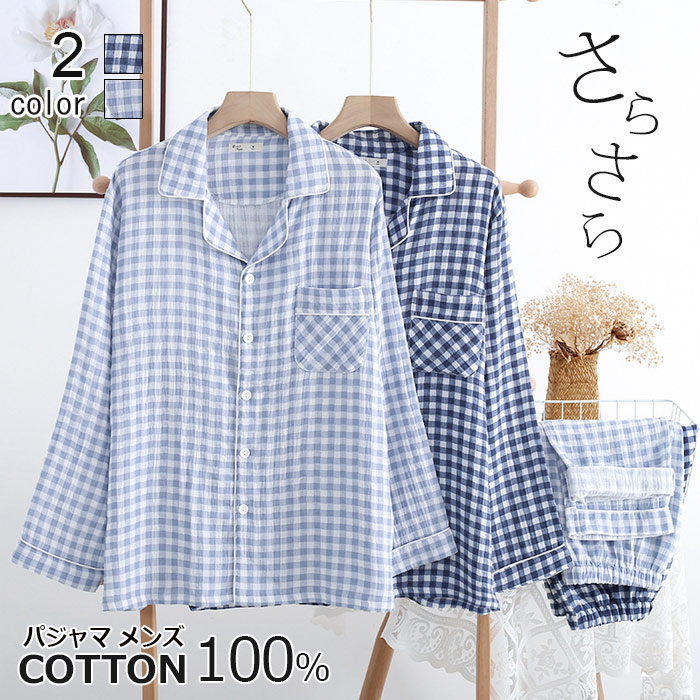 サラサラ男性用ダブルがーせ部屋着セットアップ春 チェック柄 リラックス 涼しい 父の日プレゼントギフト ゆったり ルームウエア上下