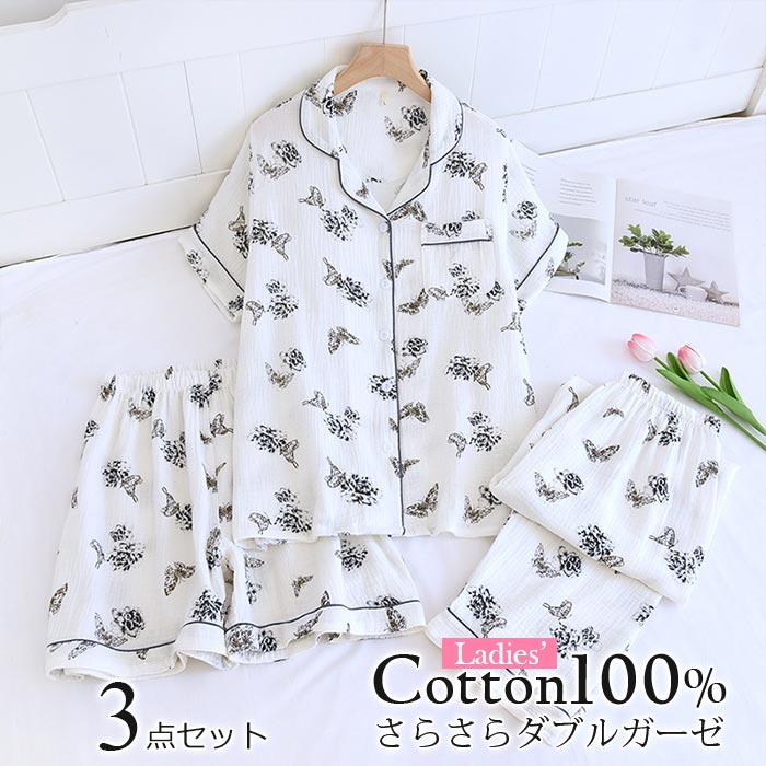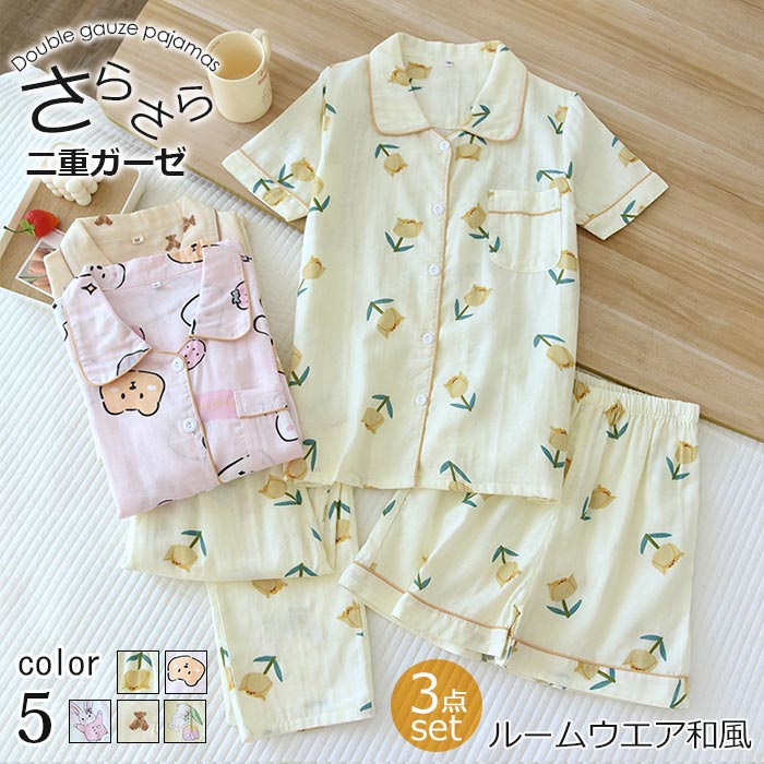 5色展開 可愛いパジャマ3点セット 二重ガーゼパジャマ 前開き ダブルガーゼ 部屋ぎ 春夏 薄手 涼しい