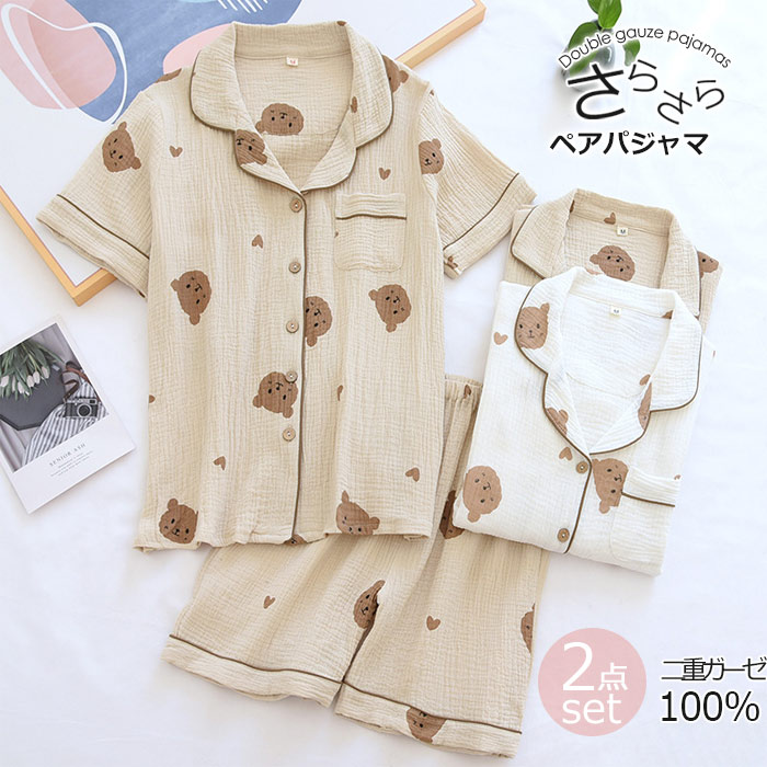 ペアパジャマ ユニセックス 半袖半ズボン カーキ 白 夫婦 パジャマ 前開き 熊柄 ダブルガーゼ 二重ガーゼ