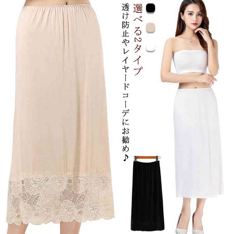透け対策 重ね着 レイヤード レース付き ペチコート ペチスカート ロング丈 インナースカート ベージュ ホワイト ブラック
