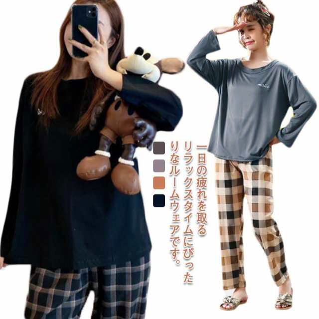パジャマ おうち時間 春秋 チェック風 泊まり パンツ Tシャツ お洒落 カジュアルインナー 下着 ナイトウェア レディース ナイトウェア ルームウェア ルームウェア 上下セット