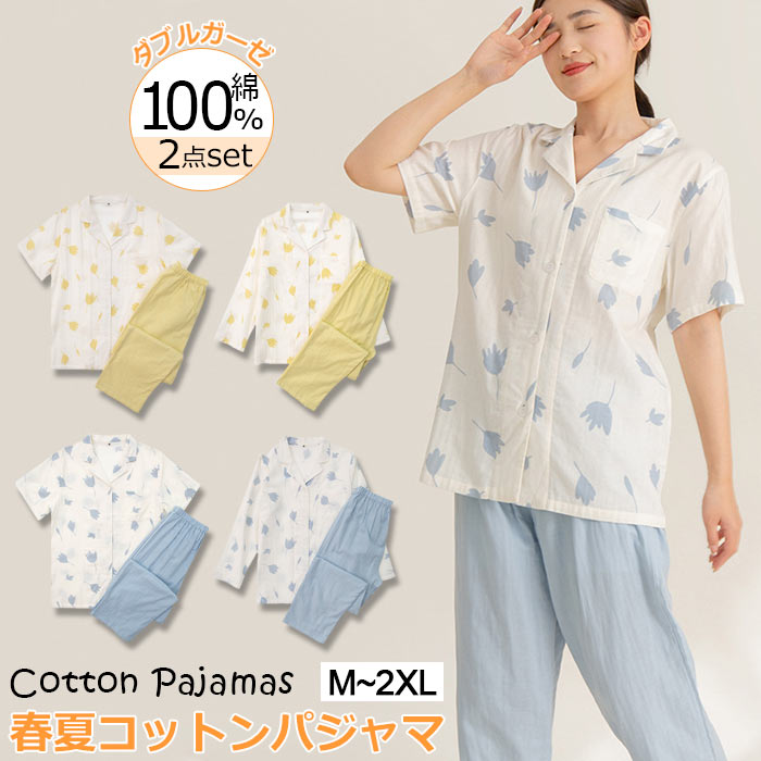 vネック花柄パジャマ上下セット洗うごとに柔らかな風合いになり綿100%ガーゼ ゆったり カジュアル ルームウエア