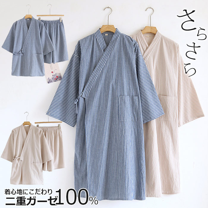 和風パジャマ 前開き 快適パジャマ ルームウエア 部屋着 夏用 涼しい 寝巻き ガーゼパ入院 外泊 春 夏 男らしいダブルガーゼ ストライプ 半袖半ズボン