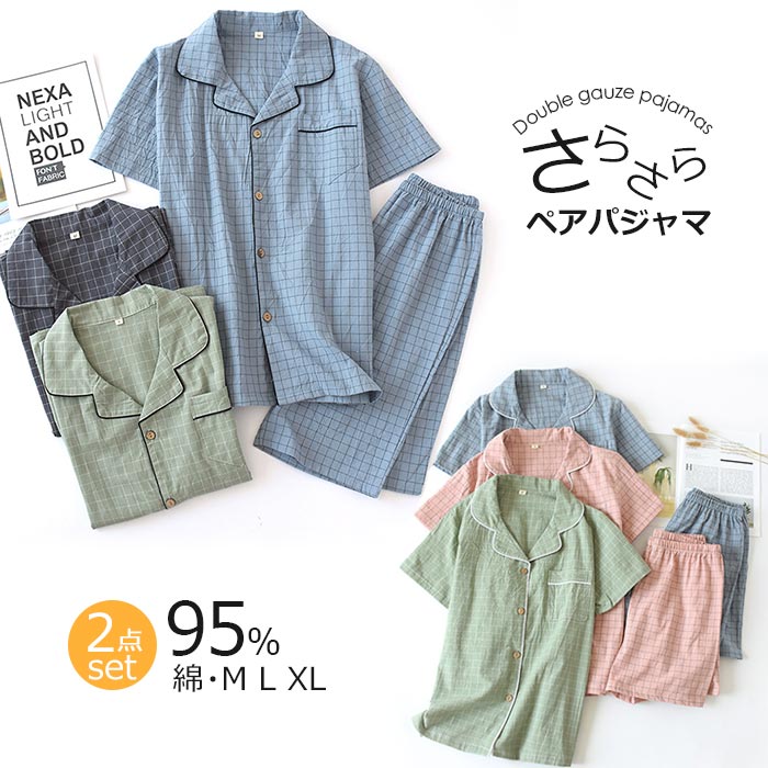 ダブルガーゼ二重ガーゼカップルお揃い服セットアップ上下セット 春 夏服 涼しい 綿100ゆったり カジュアル