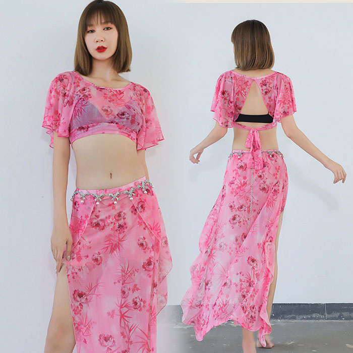 ベリーダンス 衣装 セット レッスン着 セットアップ おしゃれ 花柄 スリットオーバー スカート ロング丈 シフォン 花柄 プリント ダンス衣装 ステージ衣装 ダンス 発表会 上下セット 半袖 ロング