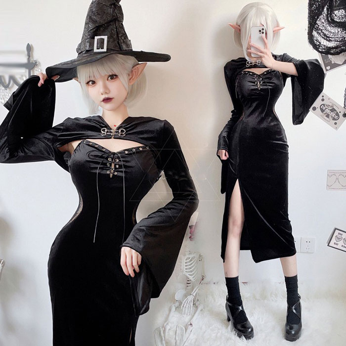 ハロウィン コスプレ レディース ウィッチ 仮装 衣装 大人 ハロウィン 衣装 巫女 魔女 コスチューム ハロウィンコスプレ ブラック 黒 ベロア ワンピース ロング丈 長袖 トップス セット衣装 セ