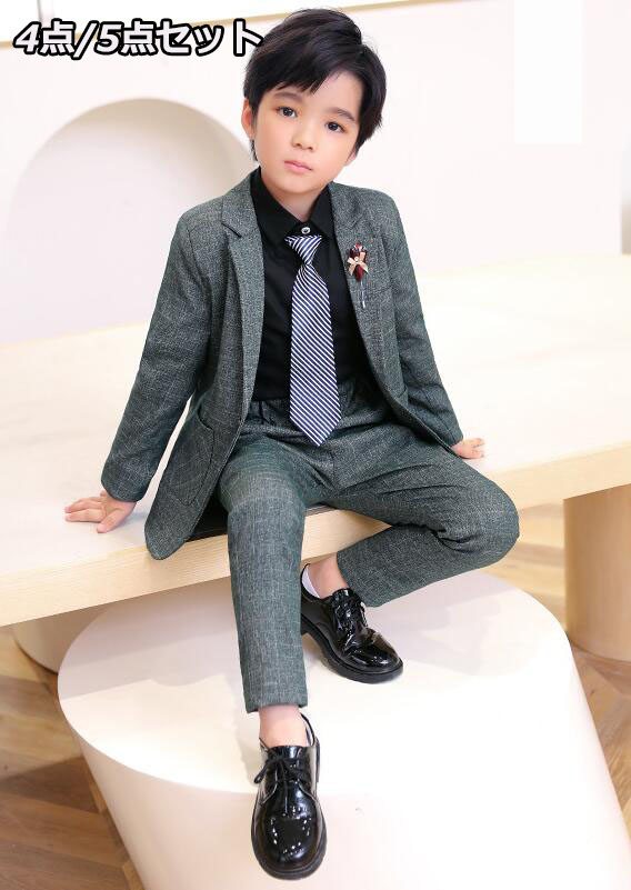3色 5点セットアップ 無地 イギリス風 子供スーツ タキシードスーツ ジャケット+シャツ+ズボン+ネクタイ+ブローチ 90~170cm 入学式 メンズ ピアノ 司会 演奏会 防シワ加工 上下セット