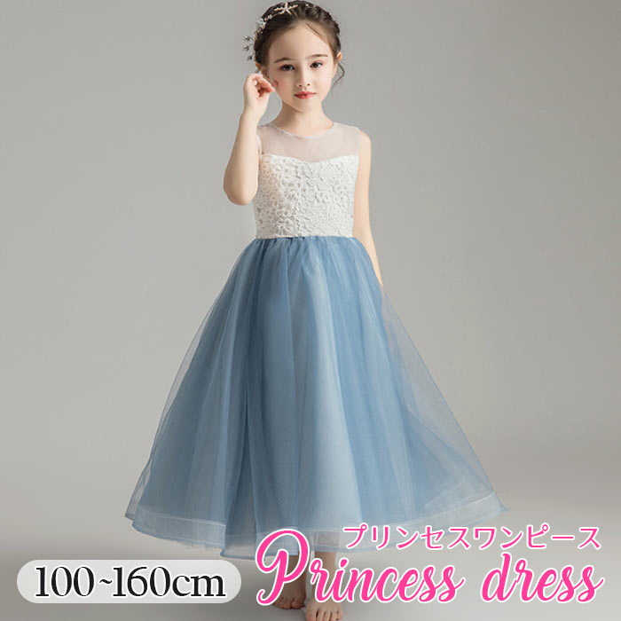子供結婚式ドレス 無地 ロング丈 シンプル ピアノ発表会 ワンピース 女の子 中学生 140 150 上品 女の子 ブルーとても高級感のある上品なドレス