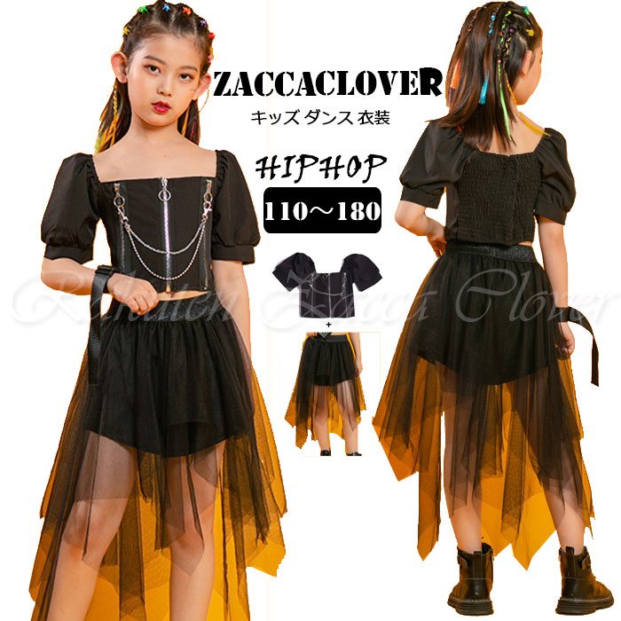 キッズ 子供用 ダンス 衣装 ヒップホップ セットアップ ブラック 黒 衣装 半袖 トップス ショート丈 へそだし チュールスカート レディース ジュニア おしゃれ ダンス衣装 大きいサイズ 150