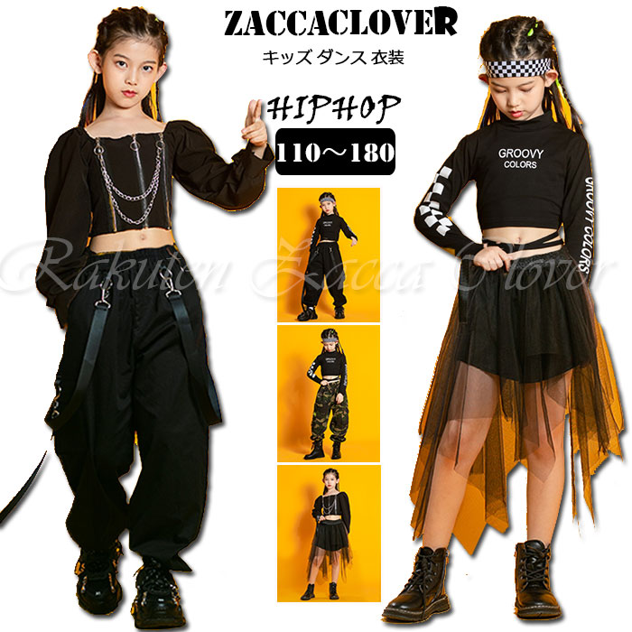 キッズ 子供用 ダンス 衣装 ヒップホップ セットアップ ブラック 黒 衣装 長袖 トップス ショート丈 へそだし 黒 迷彩 パンツ ロング丈 おしゃれ レディース ジュニア ダンス衣装 大きいサイズ