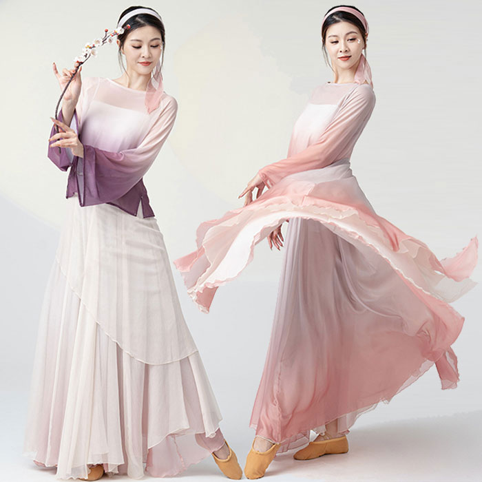 ダンス衣装 長袖 トップス ロング丈 シフォン 巻きスカート フレアスカート 美しい グラデーション ふんわり シフォン スカート ダンス レッスン着 レディース 大人 ダンス 発表会 ステージ 舞台
