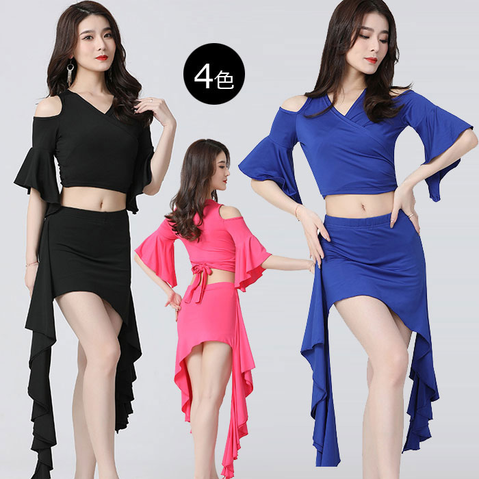 ベリーダンス衣装 セット衣装 無地 伸縮性 レッスン着 ベリーダンス 衣装セット インナーパンツ付き ショット丈 スカート 半袖 肩出し トップス おしゃれ ベリーダンス 衣装 ダンス レッスン着 舞
