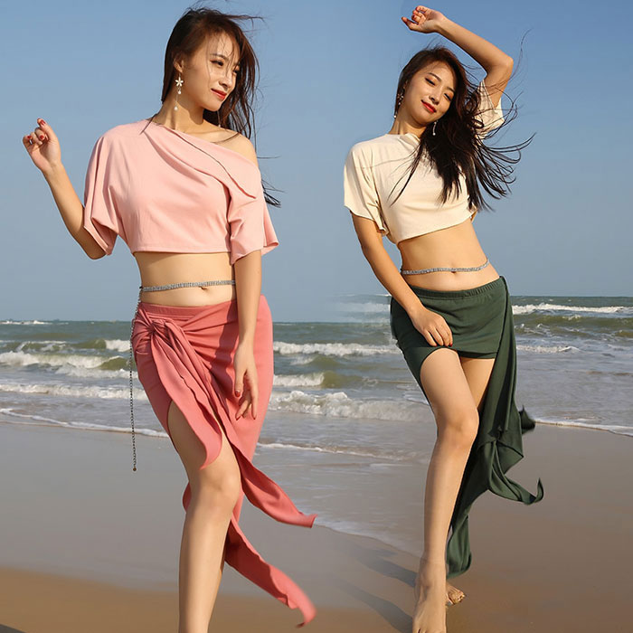ベリーダンス 衣装 セット レッスン着 セットアップ 無地 シンプルロング丈 スカート ドルマンスリーブ 半袖 トップス ストレッチ 動きやすい伸縮生地 おしゃれ ダンス衣装 ステージ衣装 ダンス 発