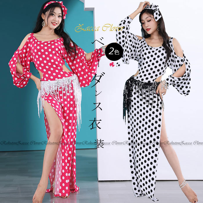 ベリーダンス衣装 ロング丈 ワンピース 水玉柄 おしゃれ ベリーダンス 衣装 髪飾りの紐 リボン付き ストレッチ素材 動きやすい ダンス レッスン着 インナーパンツ付き かわいい ダンス 舞台衣装 ス