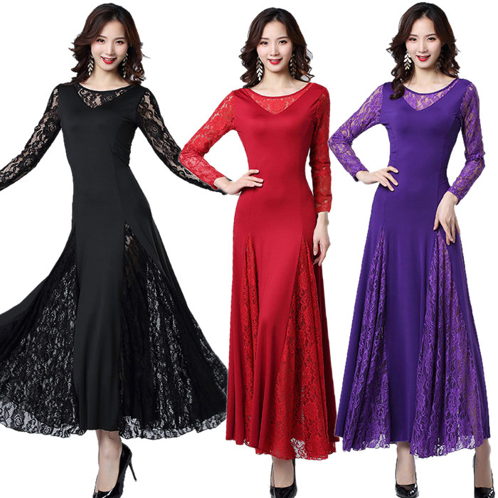 社交ダンス ワンピース ダンスワンピース ダンス衣装 ダンスウェア 社交ダンス衣装 モダンドレス ロングワンピース レース 長袖 ストレッチ 発表会 ミュージカル衣装 ステージ衣装 舞台衣装