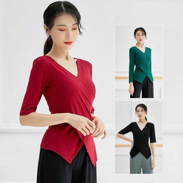 ダンス トップス ヨガ トップス 長袖 半袖 レッスン着 レディース ダンス ウェア ストレッチ 大きいサイズ xxl 3xl 動きやすい伸縮生地 無地 Vネック 美シルエット ブラック ワインレッド