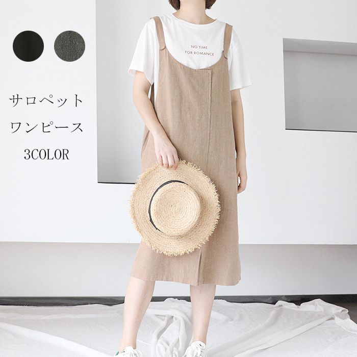 ワンピース サロペット レディース キャミワンピース ジャンパースカート スリット カーキ ブラック 無地 膝丈 ゆったり 着痩せ コーデ