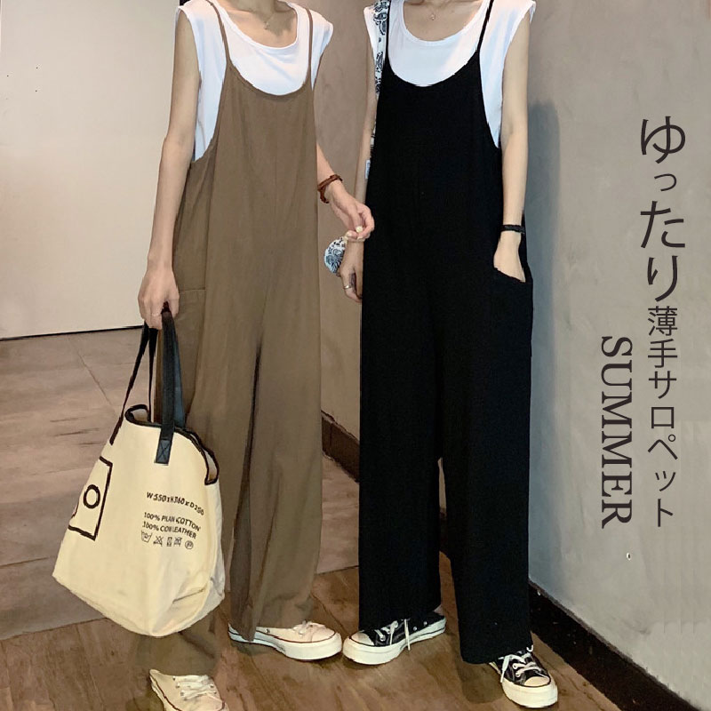 ゆったり サロペット パンツ レディース ロングパンツ サマー 重ね着 ロング丈 ワイドパンツ きれいめ カジュアル リラックス ブラック 大人可愛い 20代 30代