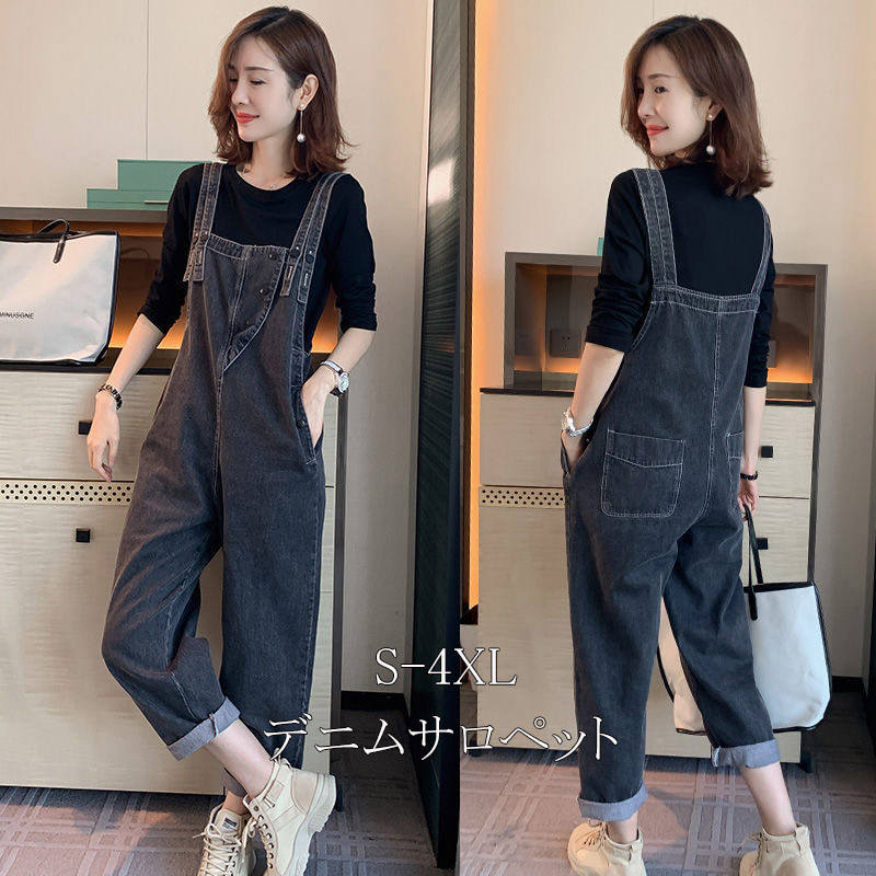 デニムサロペット パンツ ズボン サロペット レディース オールインワン デニム ジーンズ オーバーオール ロング丈 ゆったり カジュアル 着こなせ 大人 ブラック 黒